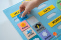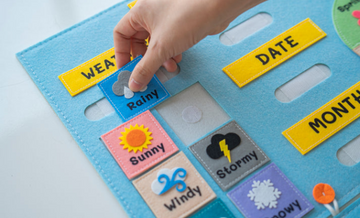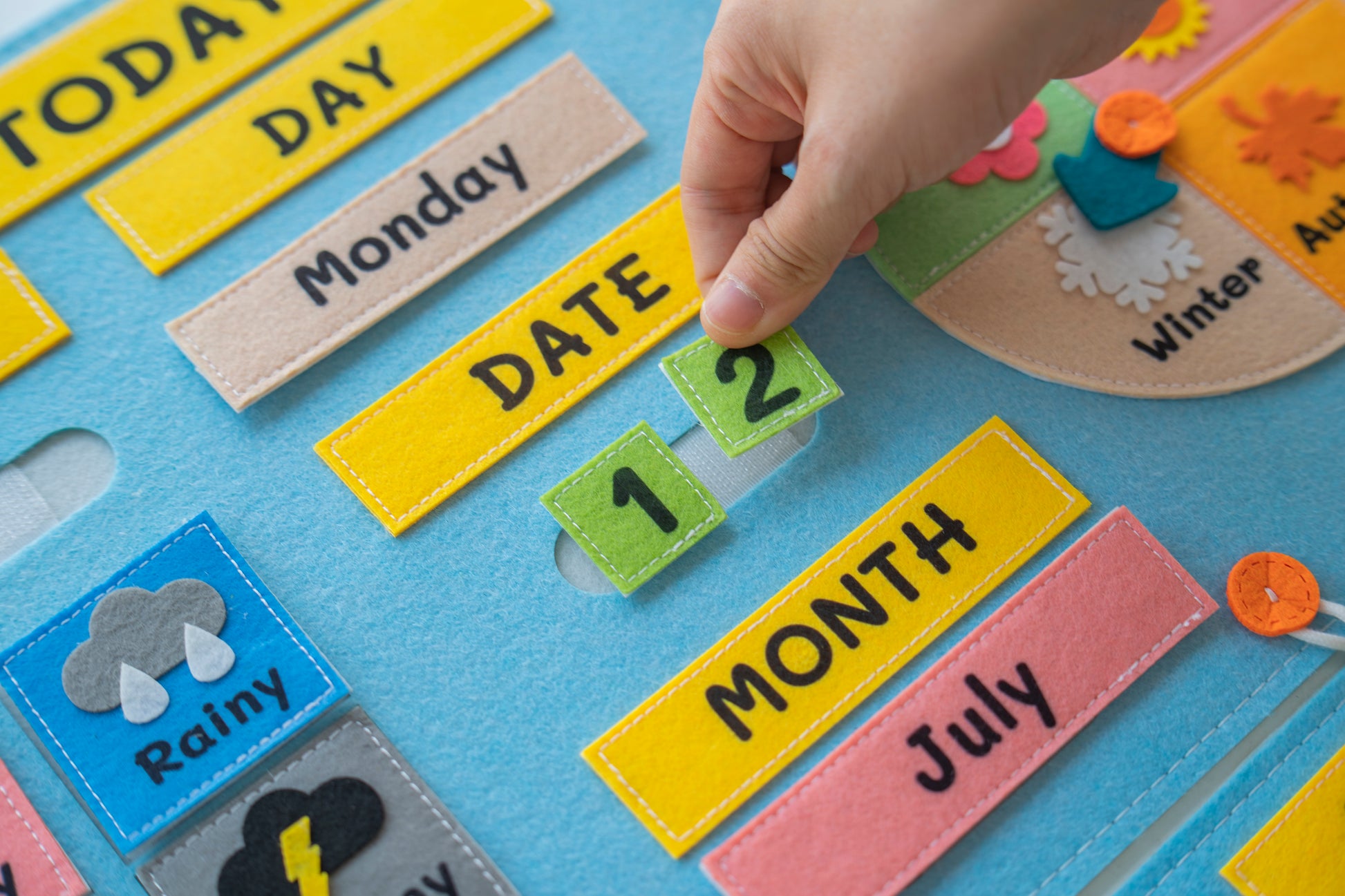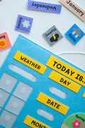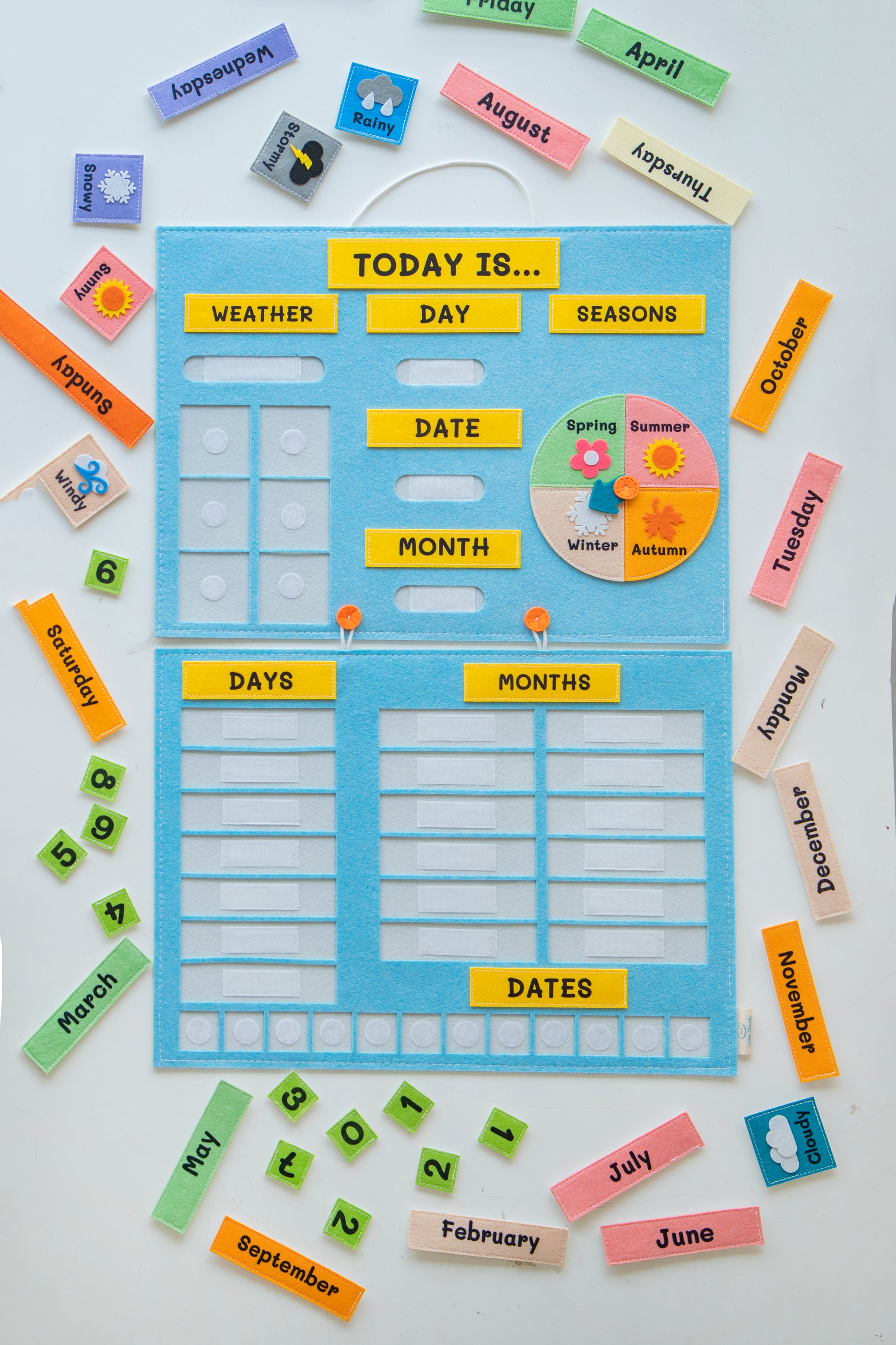 A handmade felt calendar with moveable velcro dates, months, and weather blocks to teach your child about time, seasons, and daily routines. Perfect for early learning and interactive play!